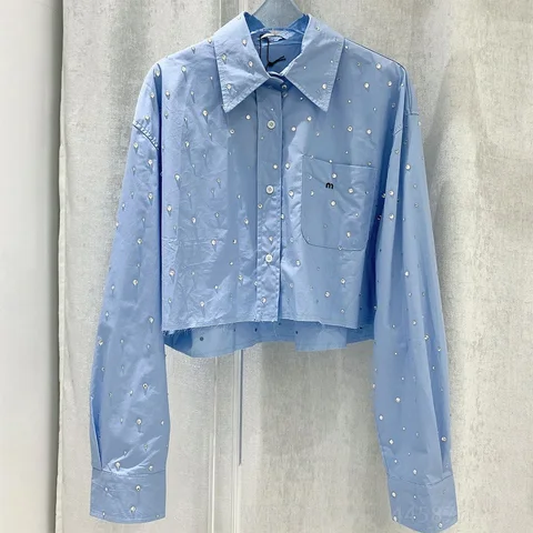 2023 Spring and Autumn New Diamond Embedding Short Thread Hem Long Sleeve Loose Blouse Top Quality