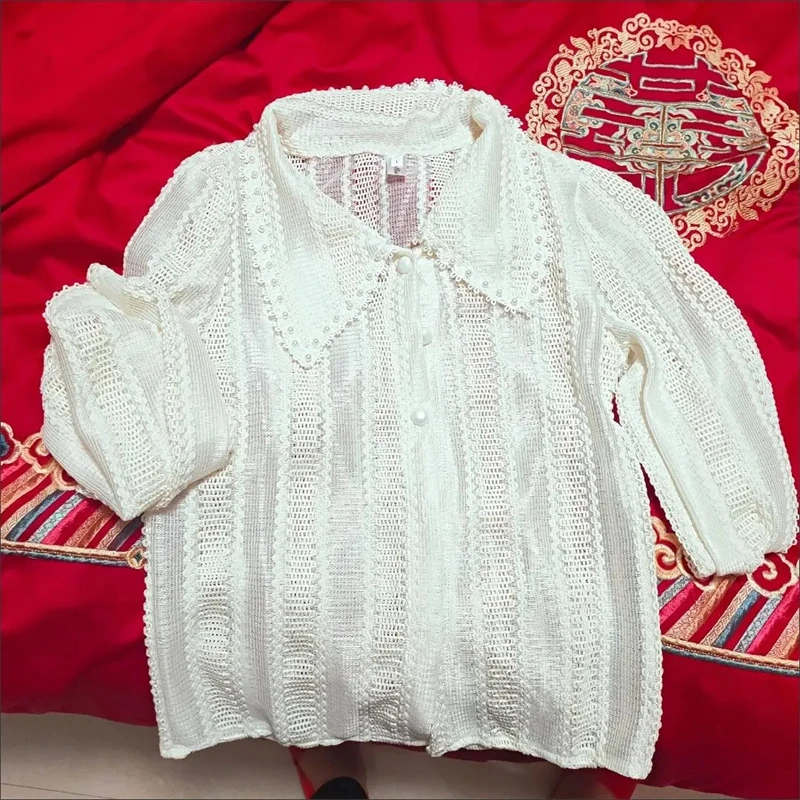 Fashion Hollow Out Peter Pan Collar Blouses Women Spring Elegant Single-breasted Pearl Button Decoration Tops Korean Thin Shirt