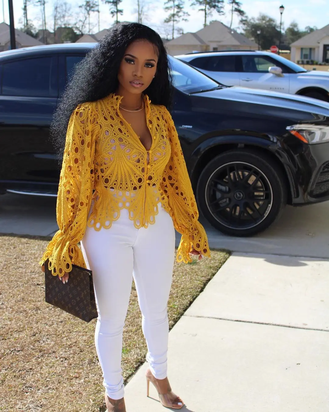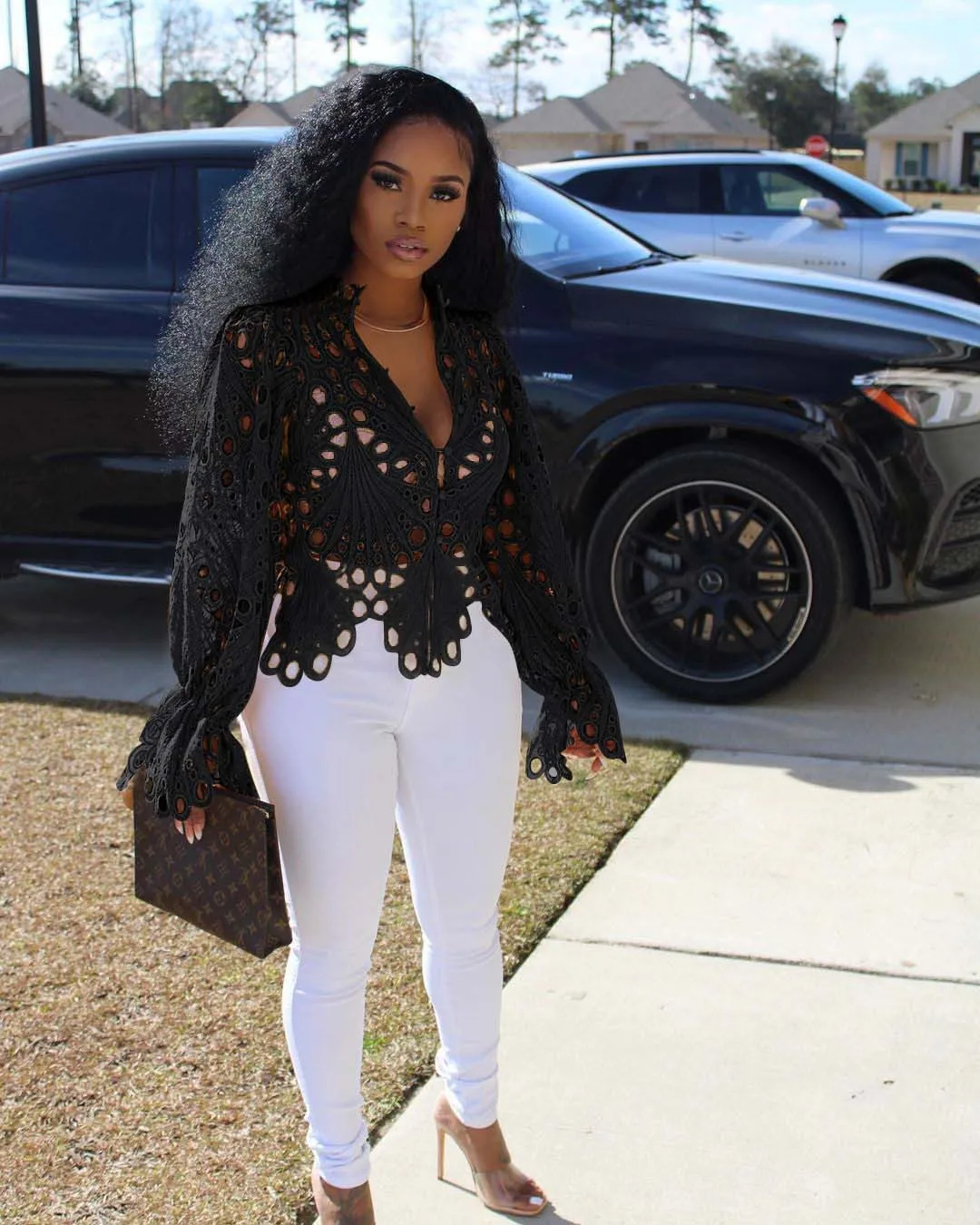 HGTE New Elegant Long Sleeve Hollow Out Mesh Lace Shirt Sheer See Through Top Blouse Clothing Dashiki African Shirts For Women