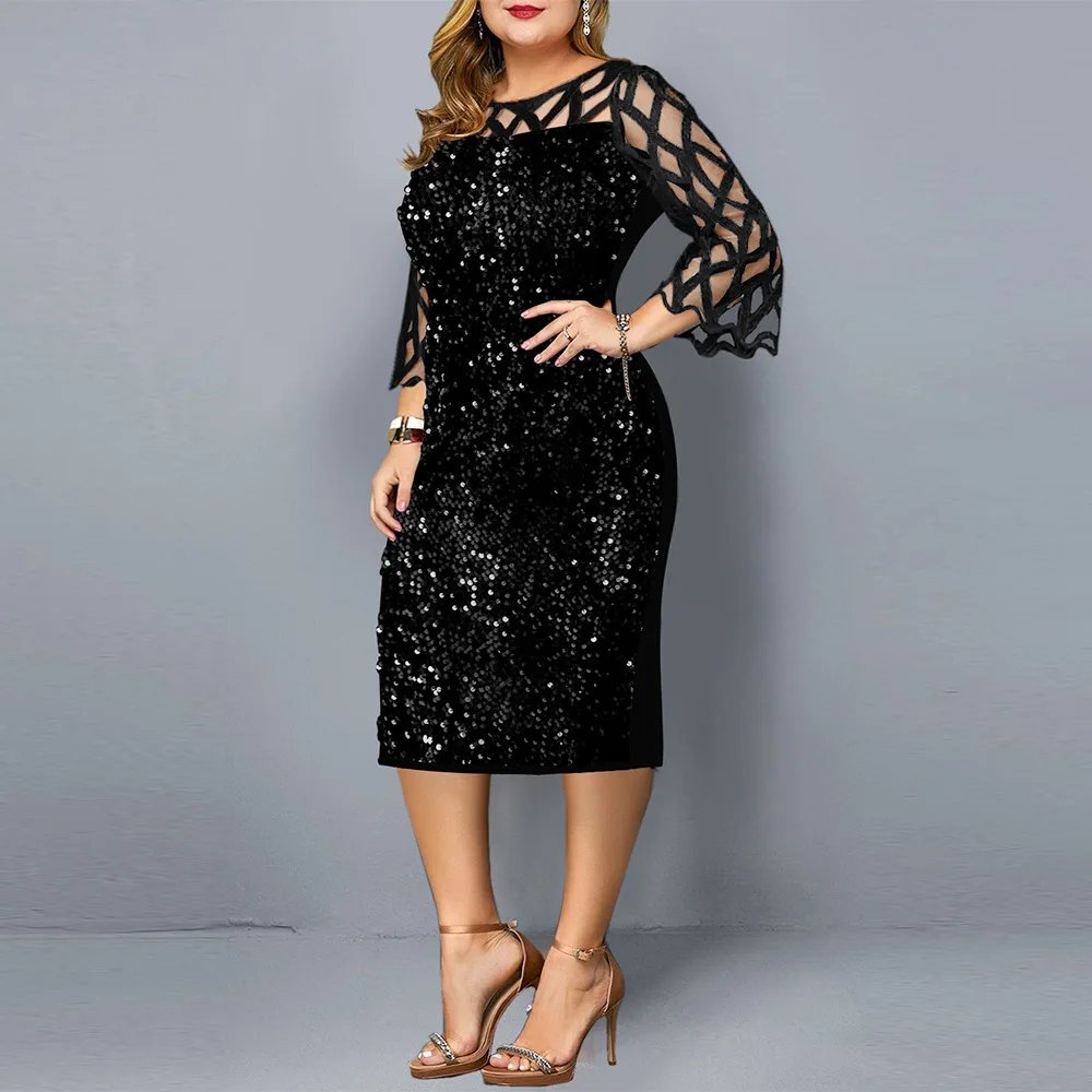 Plus Size S-5XL Fashion Women Sequins Autumn Dresses Lace Sleeve Shining Lady Casual Fashion Dress Sexy Mom Clothing O neck