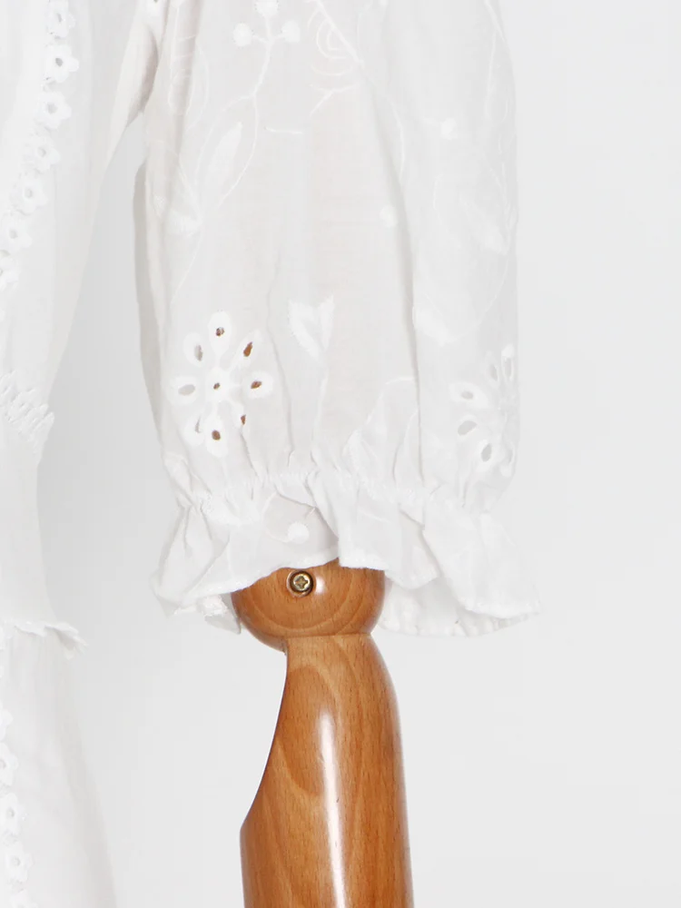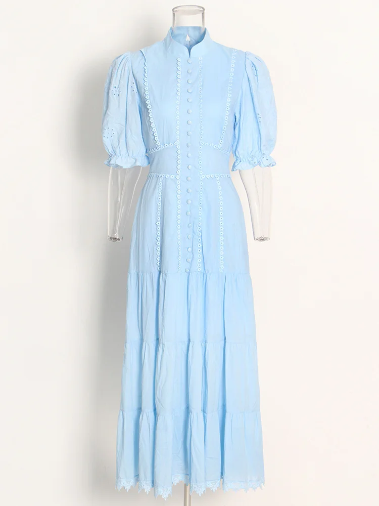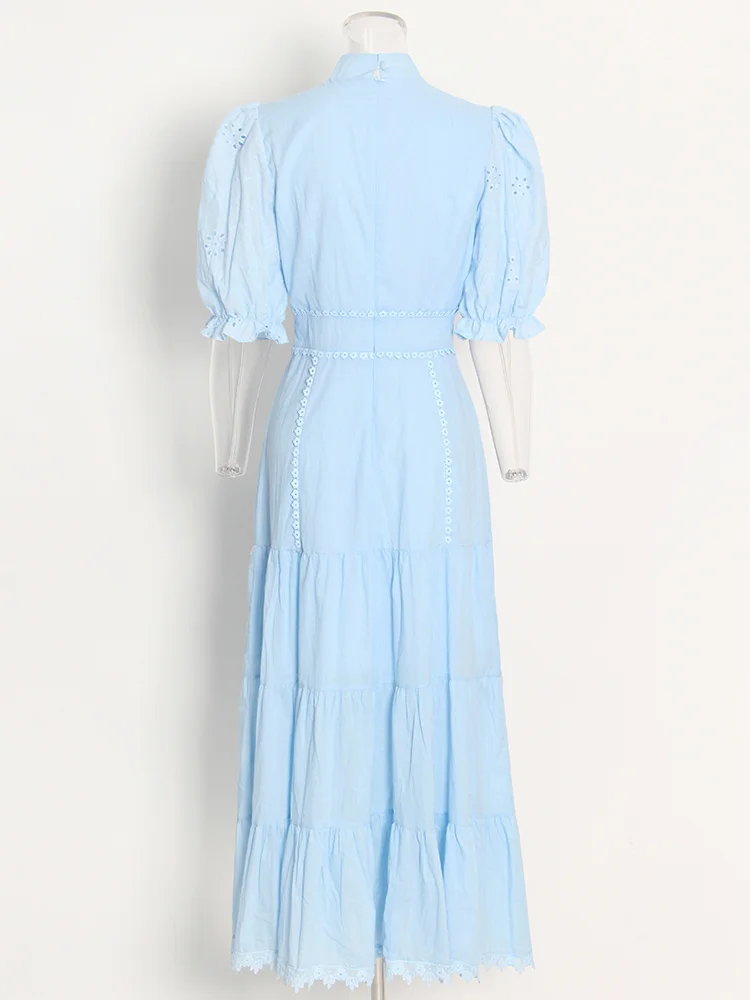 VGH Casual Solid Dress For Women Stand Collar Short Puff Sleeve High Waist Patchwork Lace Long Dresses Female Fashion Clothing