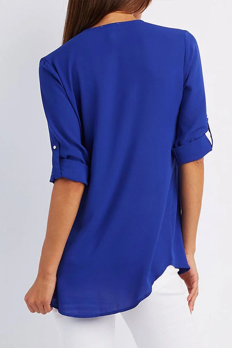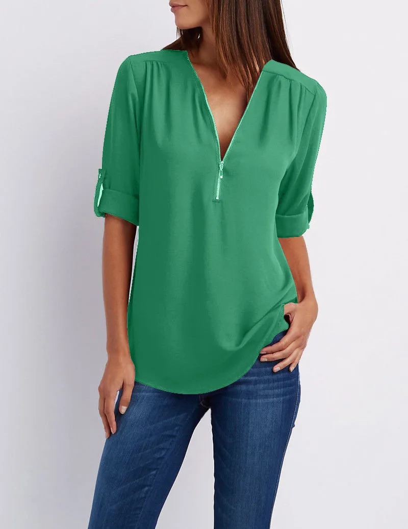 Women Chiffon Blouse Tops Summer V Neck Half Zip Short Lantern Sleeve Loose Solid Shirt Blouse EFF-6186