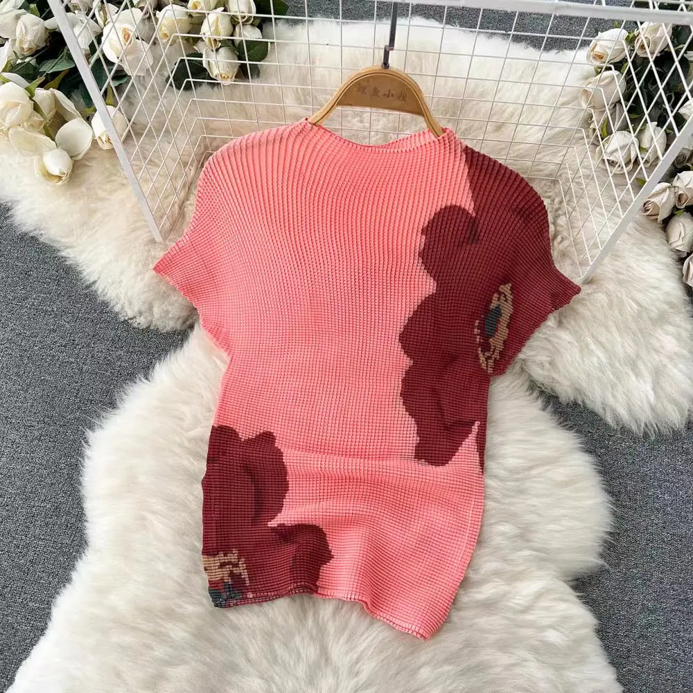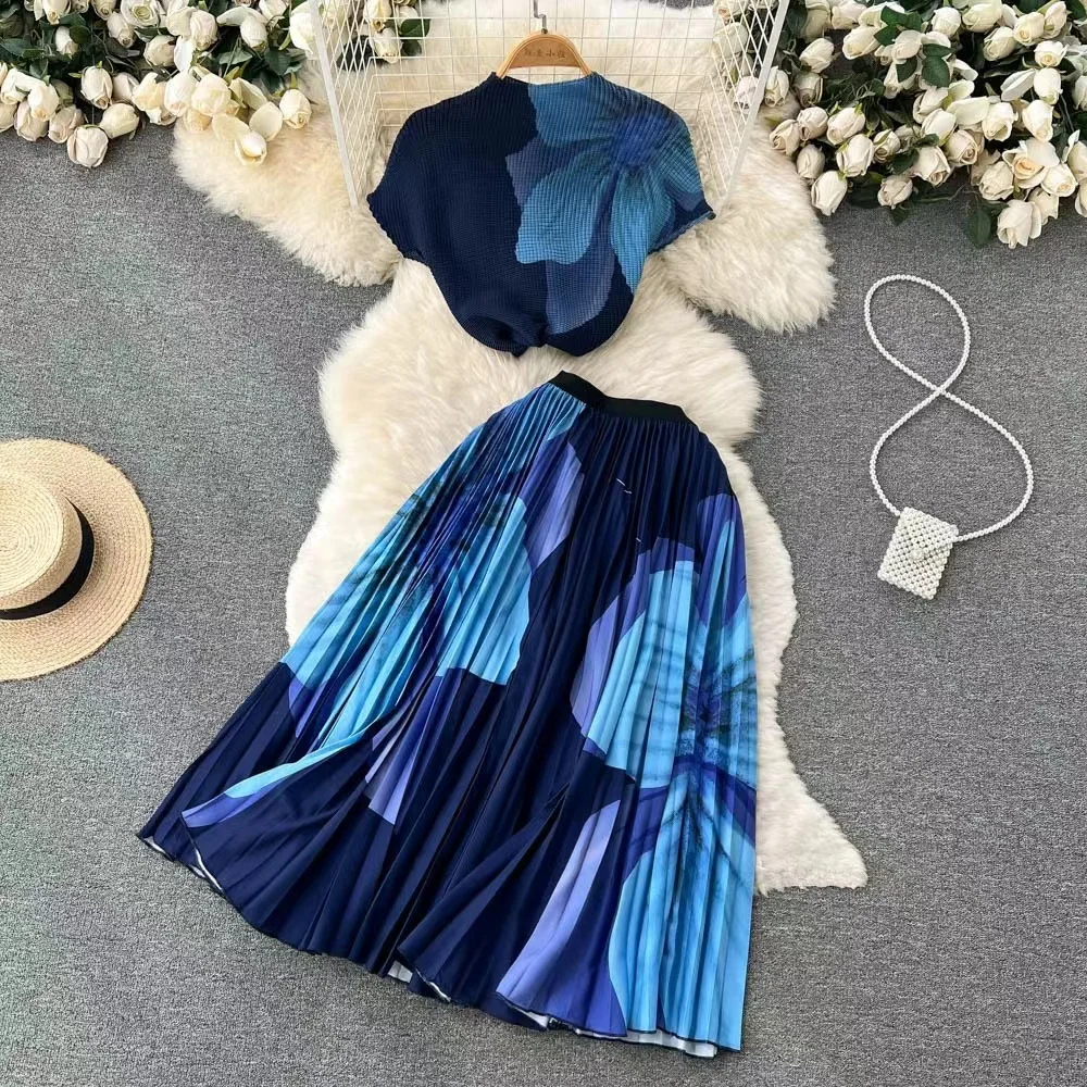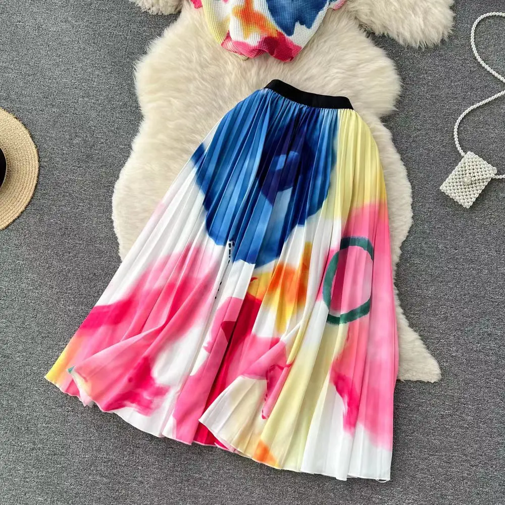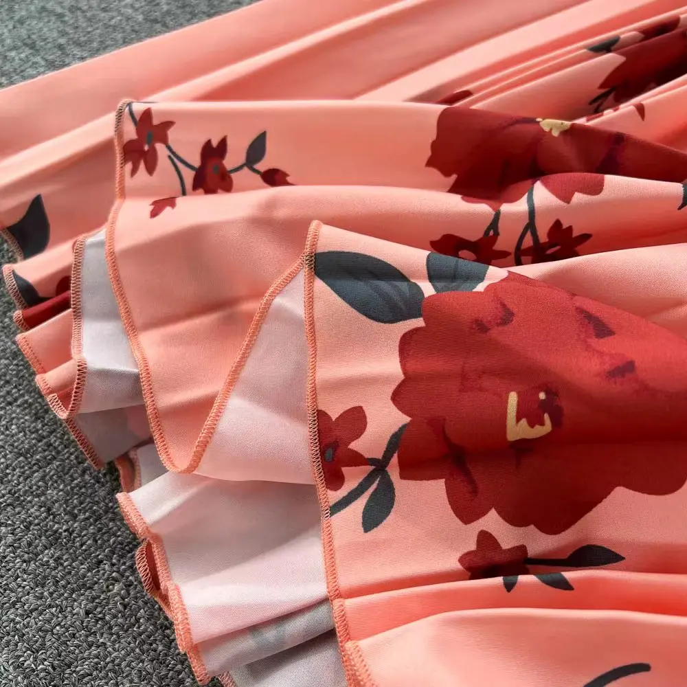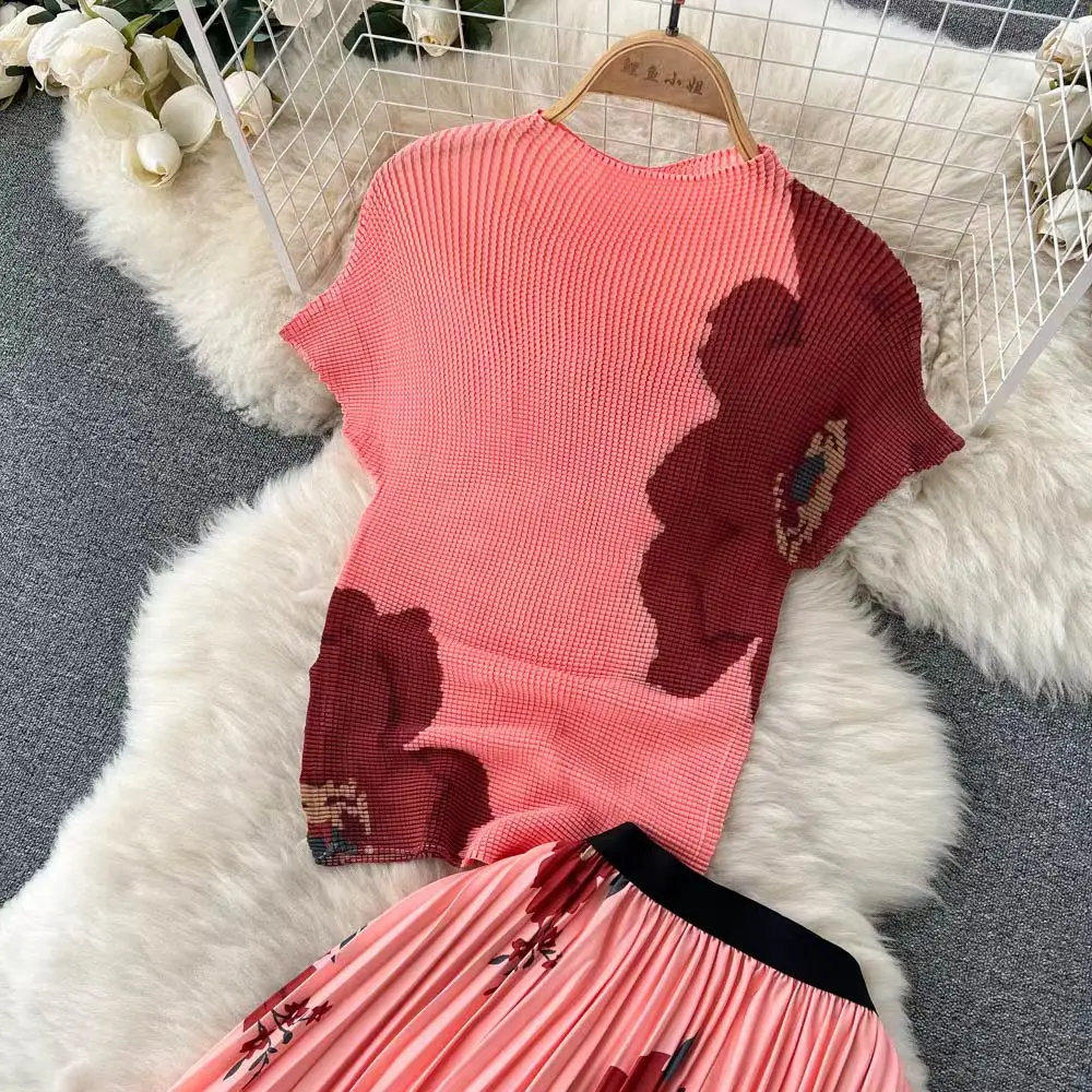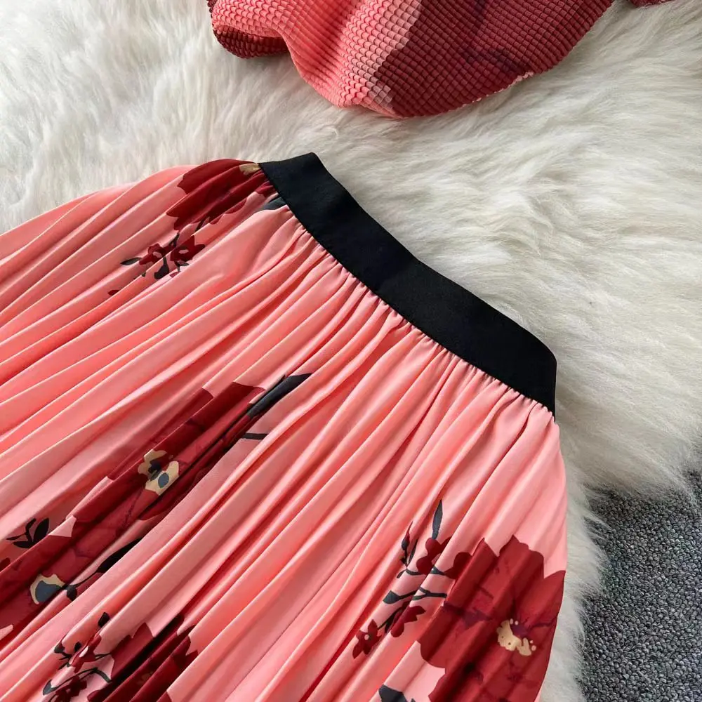 Women's Printed Short Skirt with Big Swing Pink Pleated Fashionable Commuter Skirt Summer Ladies Elastic Waist Two Piece Clothes