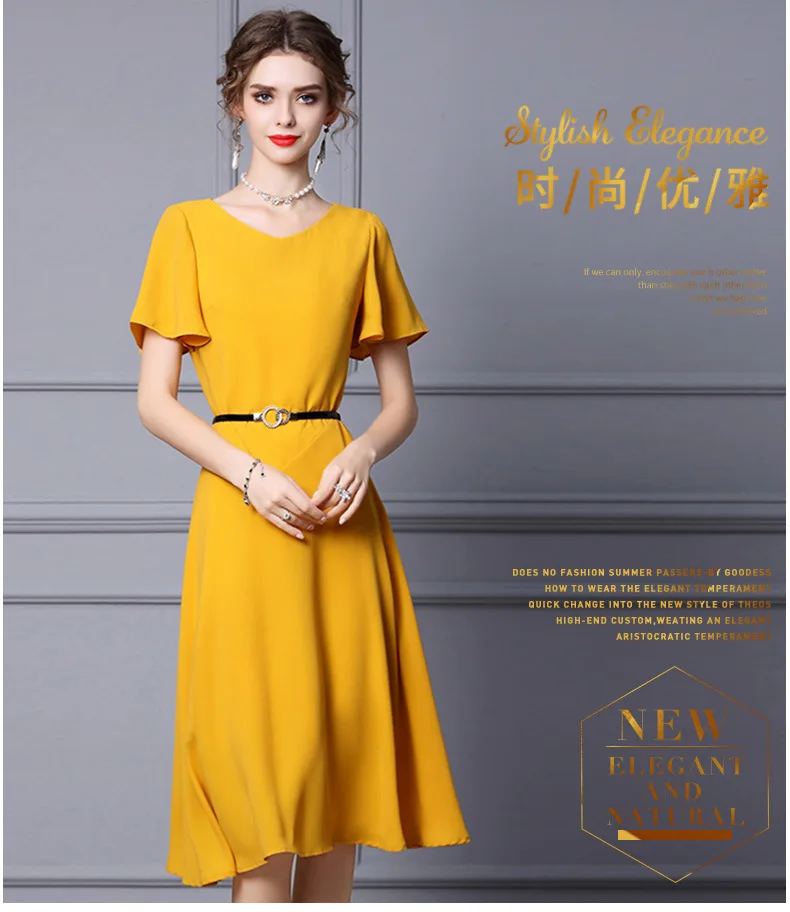 Yellow dress 2022 new women's summer ruffled short-sleeved mid-length thin A-line dress with belt